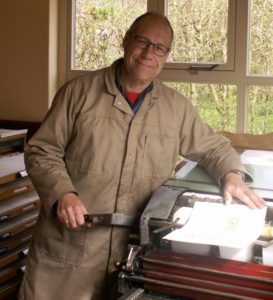 In de tussentijd schafte ik mijn eerste materialen aan. Zo kon ik aan het eind van het jaar 2000 mijn eigen drukkerij in Houwerzijl (Noordwest-Groningen – OW) inrichten. Ik werk achterin het winkelpand waar we een antiquariaat begonnen.