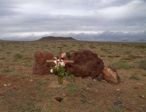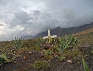 Fotograaf Jeroen Hansen: ,,Tijdens een vakantie op Lanzarote zag ik middenin het ruige verlaten landschap een kruis, een bloempje en een stapeltje stenen. Ik vond het een mystieke plek. Ik maakte een foto. Later op de vakantie kwam ik nog zo´n herinneringsplaats tegen. Ook die fotografeerde ik. Toen ik thuiskwam bekeek ik de foto´s en wist ik gelijk: hier moet ik wat mee doen.”